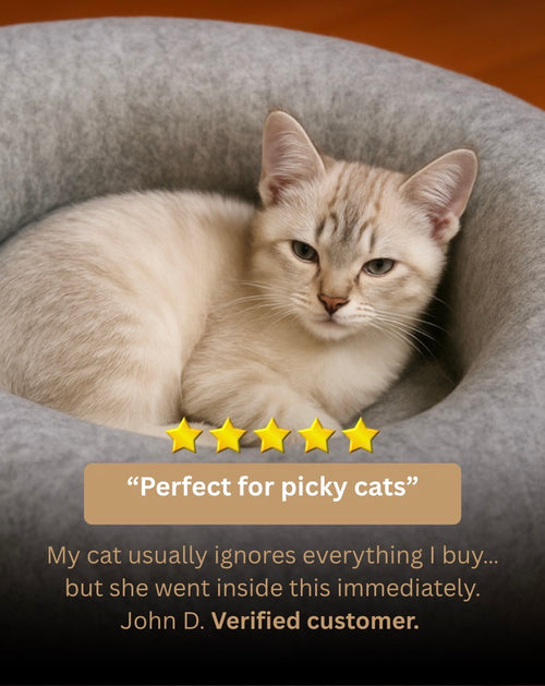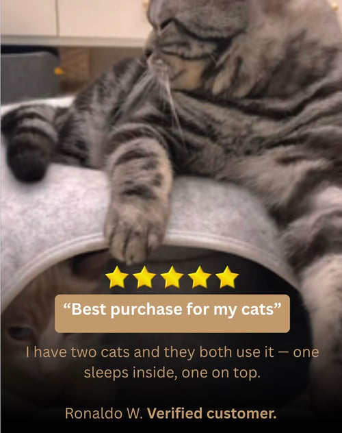 Elevate your home and your cat's happiness with this chic 2-in-1 felt sanctuary. It’s a 360-degree play tunnel and a cozy nesting bed designed to look beautiful in any modern space.
